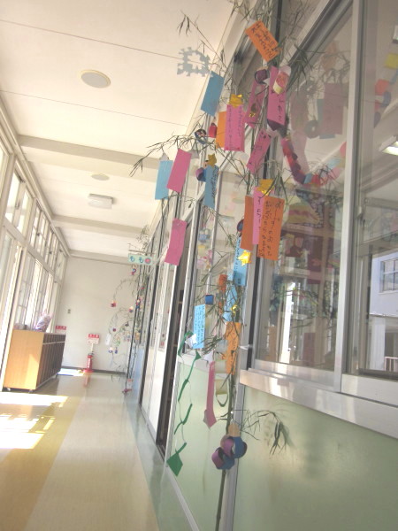 各クラスの笹には、折り紙で作った輪飾りや天の川など、