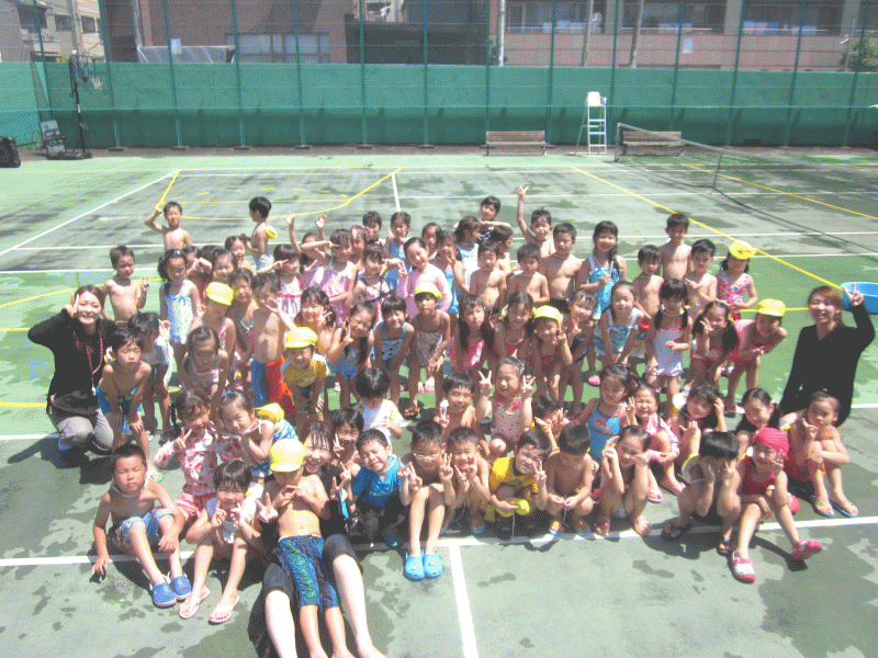 テニスコートで水遊び!