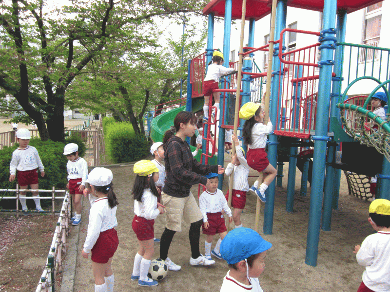 総合遊具では、年少組の子どもたちがたくさん遊んでいました。