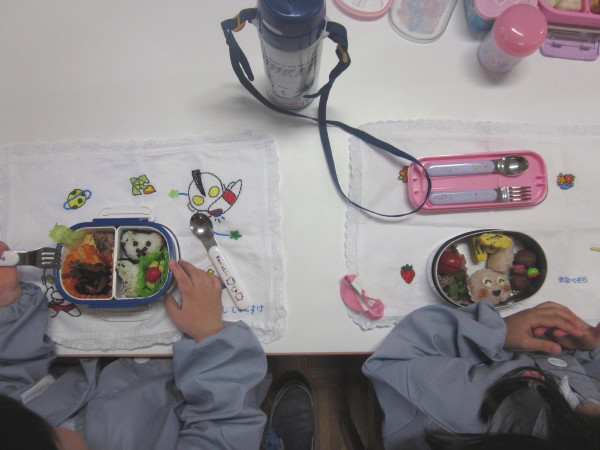 お家の人が作ったおいしいお弁当をみんなで食べます。