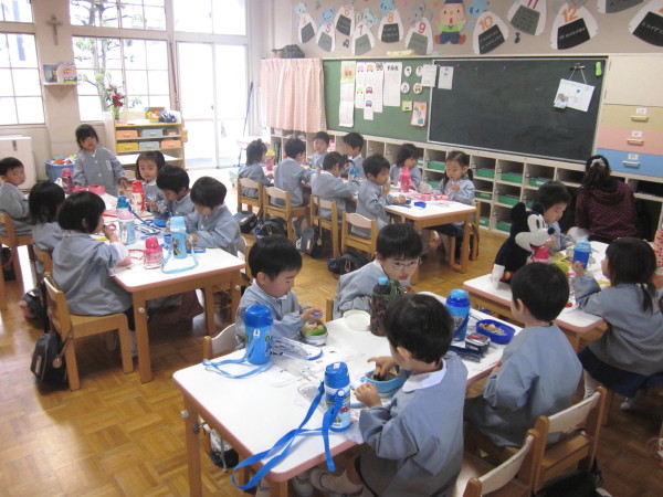 準備が出来たら、神様に「美味しいお食事をありがとうございます」とお祈りをお捧げし、「いただきま〜す」と元気にごあいさつをしていただきます。