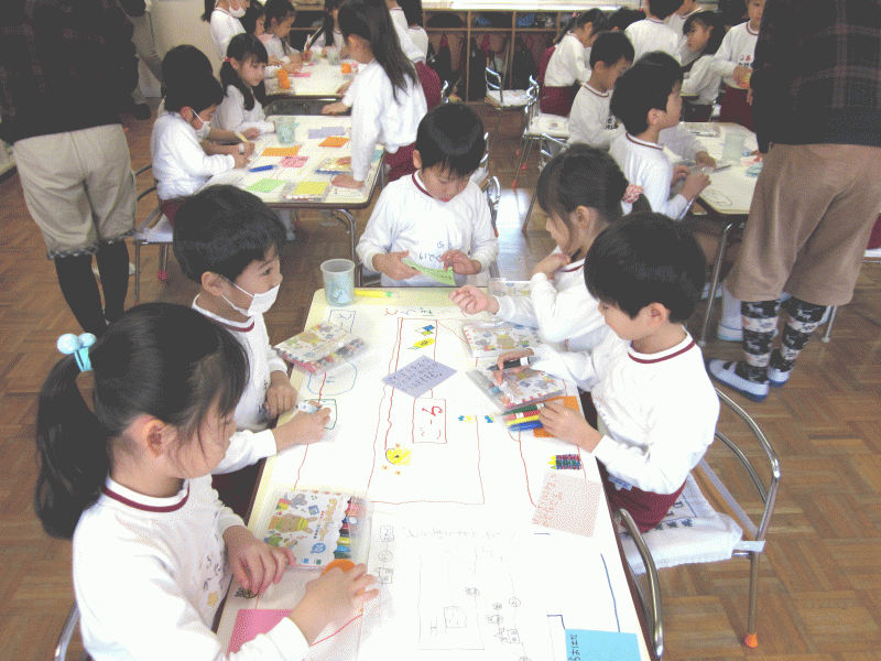 テーマにそって考えた文を、マスになる紙に書いて貼ったり、道順を書いたり、マスの周りに絵を描いたりなどして仕上げていきました!
