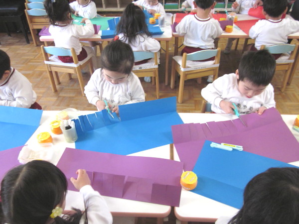 「どんなカレンダーを作ろうかな…」と事前に設計図を作り、イメージを膨らませていた子どもたちは、器用に折り紙を切って、いろいろなモチーフを作っていきます☆
