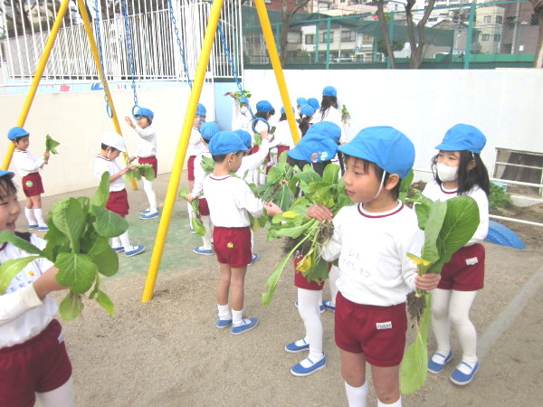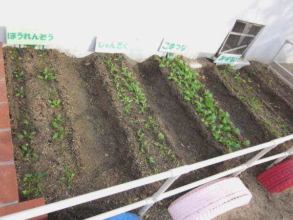 去年、園庭の片隅と、芋畑の後にまいた、野菜の種がグングン伸びて