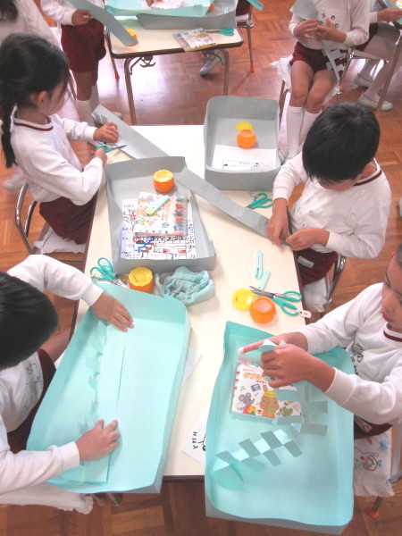 花紙をくるくる丸めてお花やリボンを作ったり、