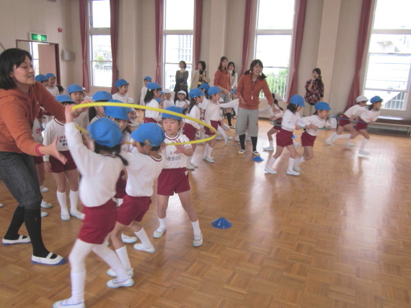 隣のお友達と一緒に、フープの中に入って、前にある目印まで走って・・・ 次の人にバトンタ〜ッチ!