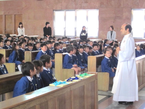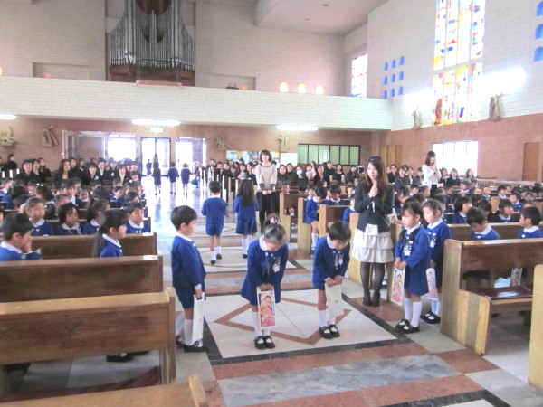 ひとりずつ、神父様におめだいを掛けてもらい、先生から記念の飴を頂きました。