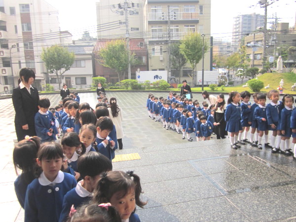 大聖堂の外では、雨のため幼稚園から大聖堂まで、園バスで移動してきた年中組、年少組のお友達が並んでスタンバイOK!