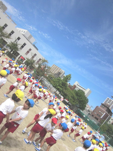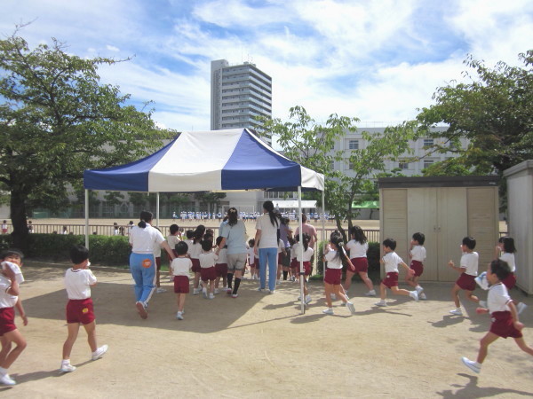 年少さんは、ビックリして泣いたお友達もいたけれど、すぐに立ち直ってみんなと一緒に神妙な顔つきで、先生の後を追いかけるように、いざ!運動場へ・・・☆
