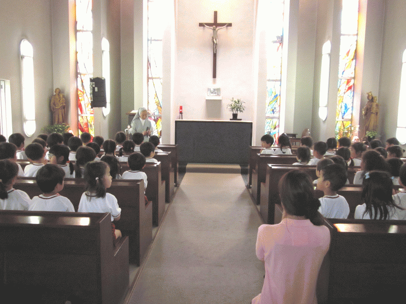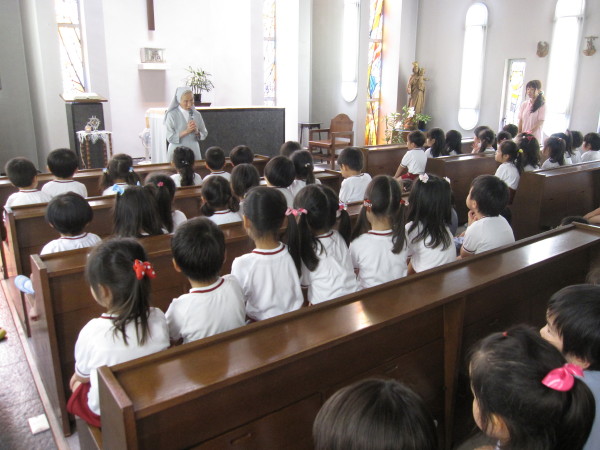 園長先生から神様のお話を聞いている子ども達の顔は、とっても真剣な表情でした。
