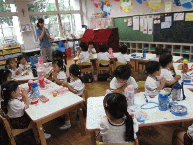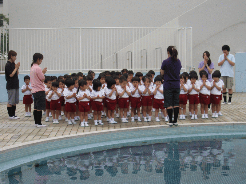 子どもたちは、ドキドキしたシャワーや、初めてのプール遊びが楽しく過ごせたことを思い出し、いろんな遊びをしたプールを見ながら、お祈りをしました☆