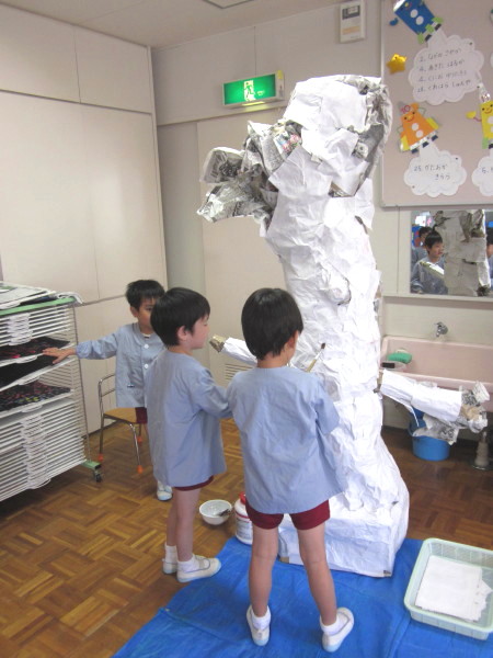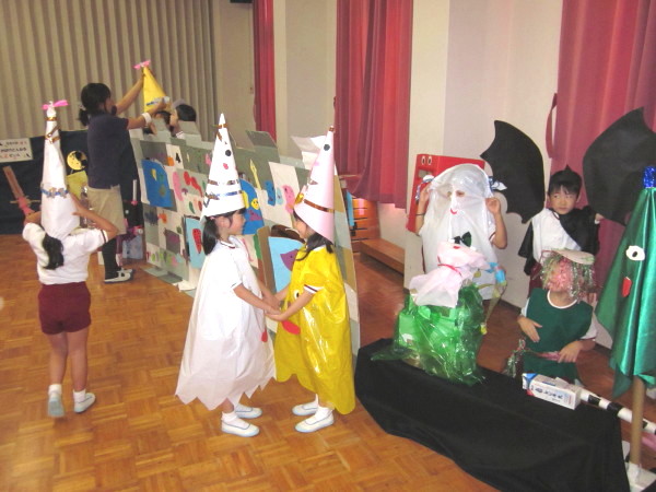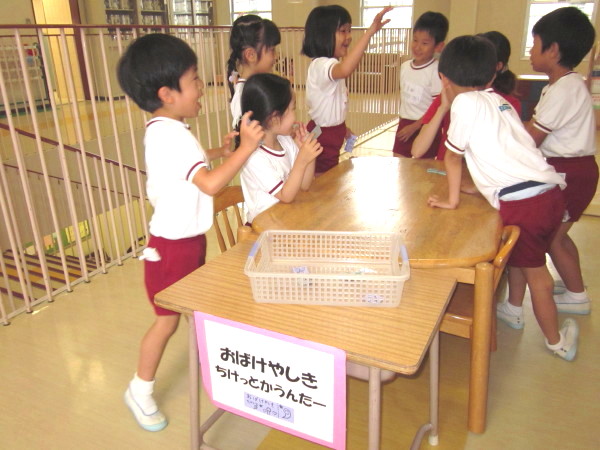 いよいよ本日、一日限りの《☆おばけやしき☆》が2階遊戯室にて公開されることになりました!!「おばけやしき」をするにあたり、クラスで何度も協議・打ち合わせを重ね、それぞれの持つおばけプランを出し合いながら、3クラスで役割分担を決めて取り組んできました。