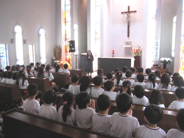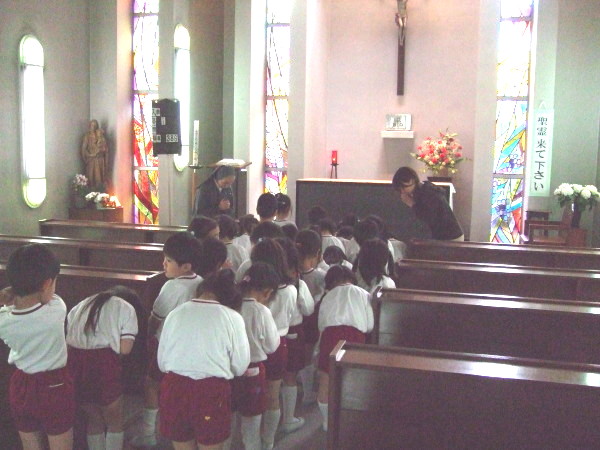 お祈りをして園長先生から神様のお話を聞いたりします。