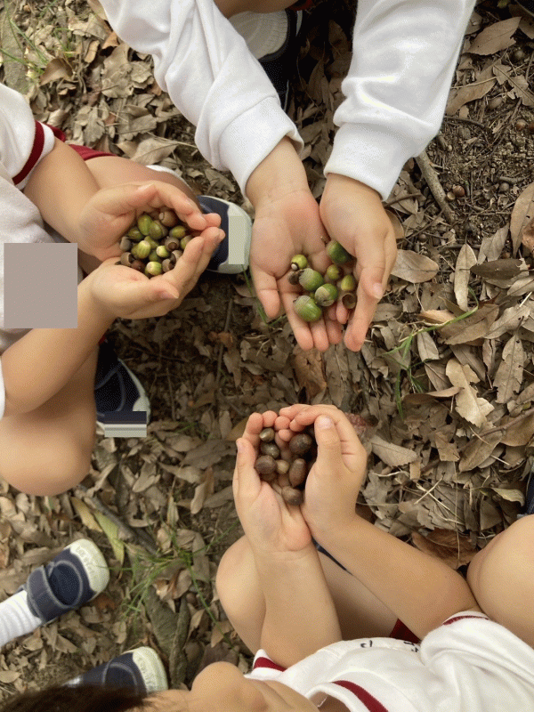 幼稚園では、どんぐりや木の実を使ってごっこ遊びをしています^^♪ご家庭でもいっぱい見つけたら、是非持たせてあげてください♪砂場で「もりのおみせやさん」が繰り広げられています!