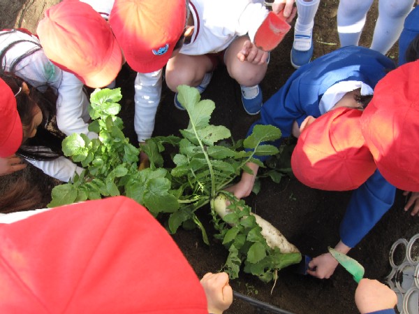 だいこんを抜きに来た年長さん、土を掘りながら、