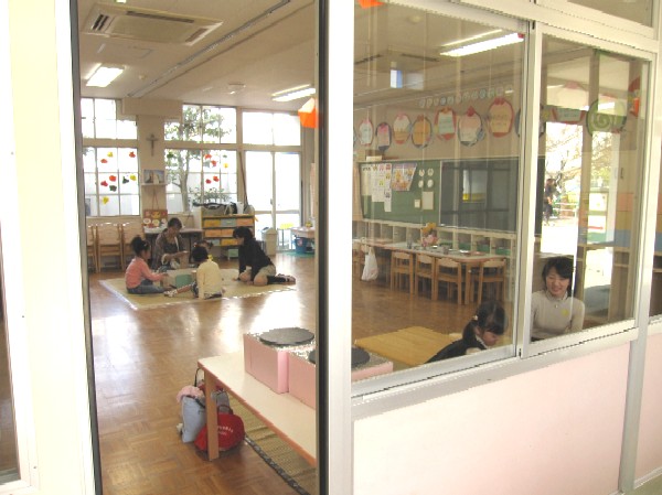 さてさて、お遊戯室にみんなで集まって、お父さんやお母さんと