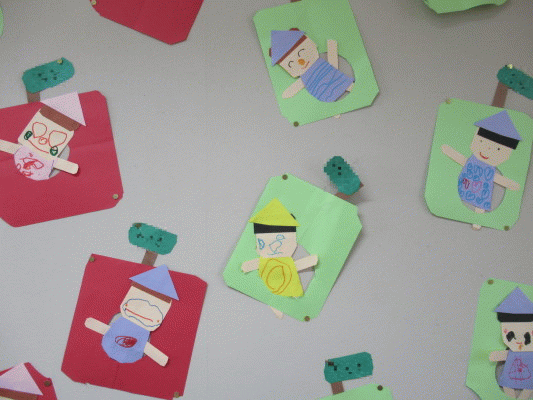 年少組の9月壁面は「はらぺここびと」です★こびとの顔、服、手足は画用紙を切ってつくりました。