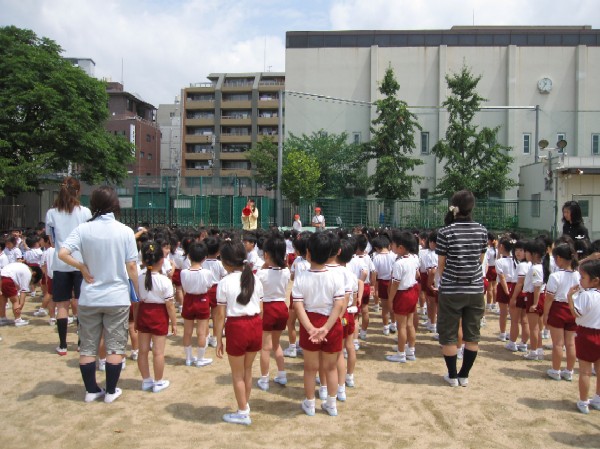 グランドに出た後は、クラス毎に整列、点呼をし報告します。
