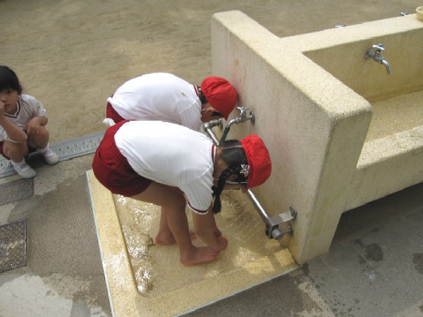 年中・年少組は先生に足を洗うのを手伝ってもらいます。