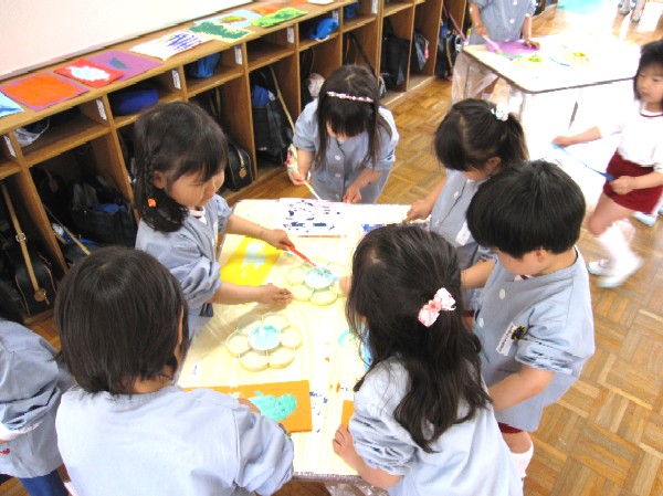 今日のさくら組は、ブラッシングという絵の具の技法を楽しんでいました。