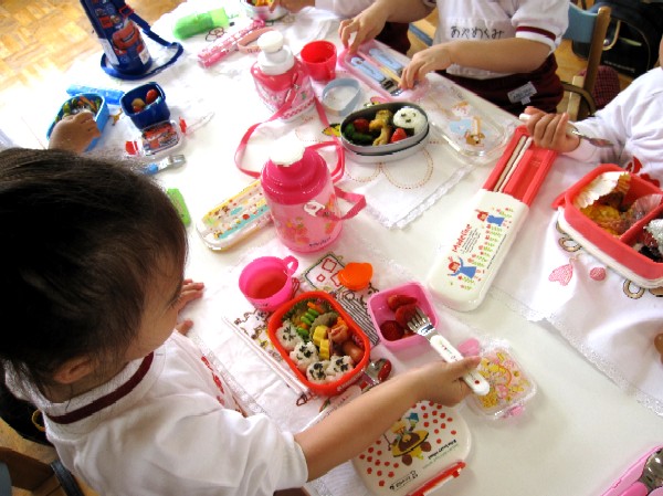 すみれ組。このときばかりは、おしゃべりを忘れてお弁当に夢中。。。