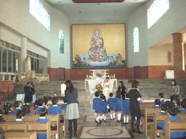 年長組の子どもたちは、一人一人神父様にメダイと飴を頂きました。