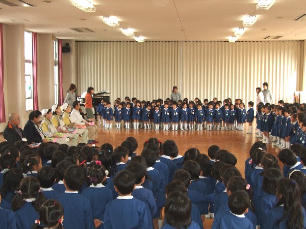遊戯室に、用務の方々・バスの運転手さんをお迎えして、感謝の日の集いを行いました。