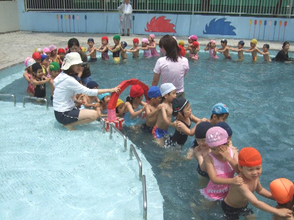 年中組みんなで水中電車出発!!トンネルくぐってプールを一周したよ。顔に水がかかってもへっちゃら☆