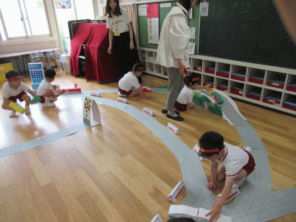 幼稚園にある道具や鞄、絵本など、子ども達がよく知っている物が目の前にずらり並んでいます。お家の人と一緒に手を繋いで、まずは封筒を手にとって中身を素早くチェック☆彡 中の紙に書いてあるものを急いで取ってきます(>▽<)