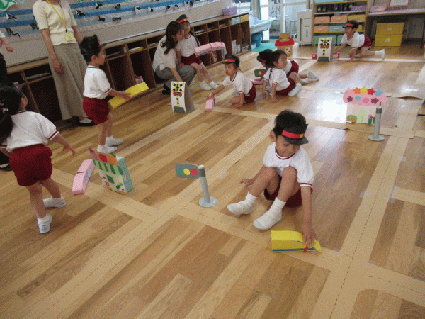 「城星モール」コーナーでは、たくさんのお店屋さんや信号などがあり、お家の人に「何が欲しい?」と聞き、おつかいに行く姿が見られました♪