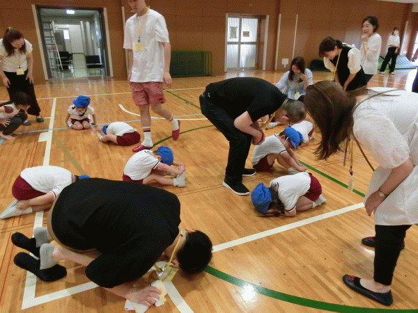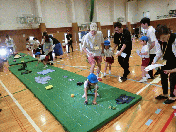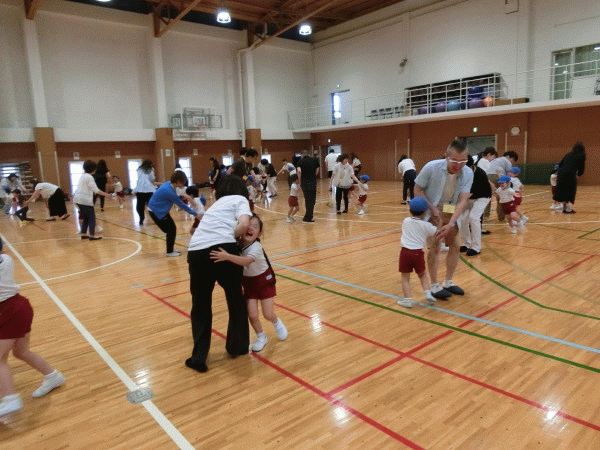 年中組は、広い体育館でお家の人と一緒に体をたくさん動かしました!!(^▽^)