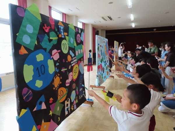 年長組は、ロケットやUFO、飛行機を作って年長組みんなで遊戯室に集まり、的あて大会をしました!