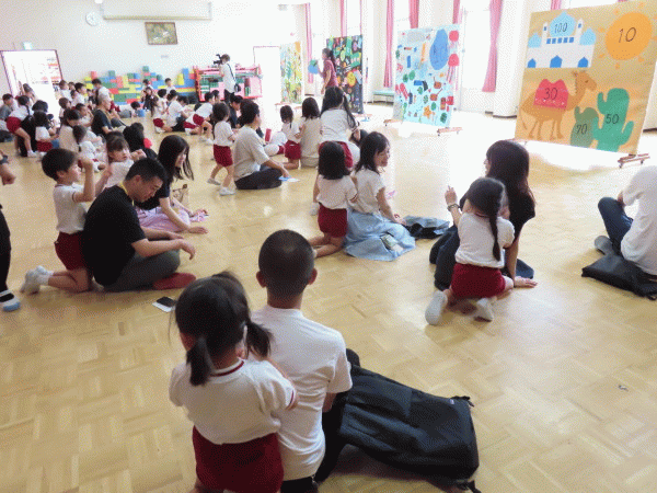 まずは、体操からスタート!体操は「汗かき親子体操」です。幼稚園とお家で練習してきたみんなは、しっかりと覚えていて、伸び伸びと体を動かして、これから始まるゲームに準備はバッチリ!!