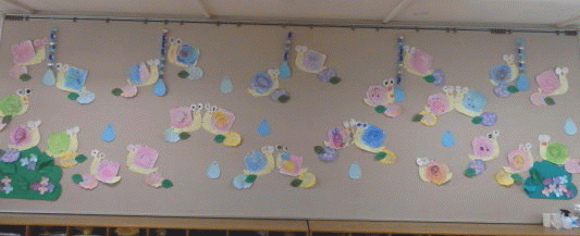 あじさいも制作して一緒に飾り、雨が多い梅雨の6月を感じられることのできる素敵な壁面になりました☆