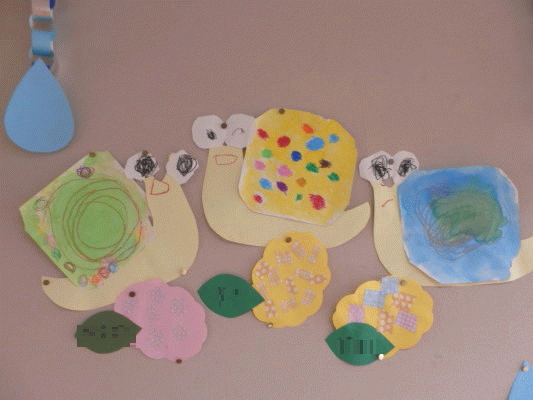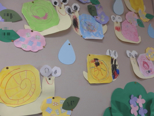かたつむりの目は角切りをし、クレパスで目を描きました。殻は角切りをしてクレパスで模様を描き、絵の具を塗ってはじき絵にしました!