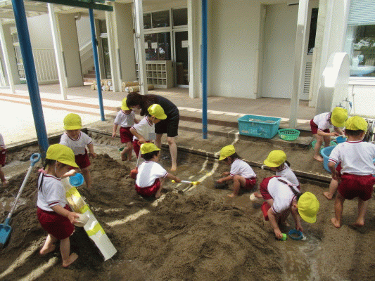 バケツで水を運んだり、シャベルで川を掘ったり、一番人気だったのは“おままごと”。小さいカップに水や泥を移し替えて、お友だちや先生と遊びます。