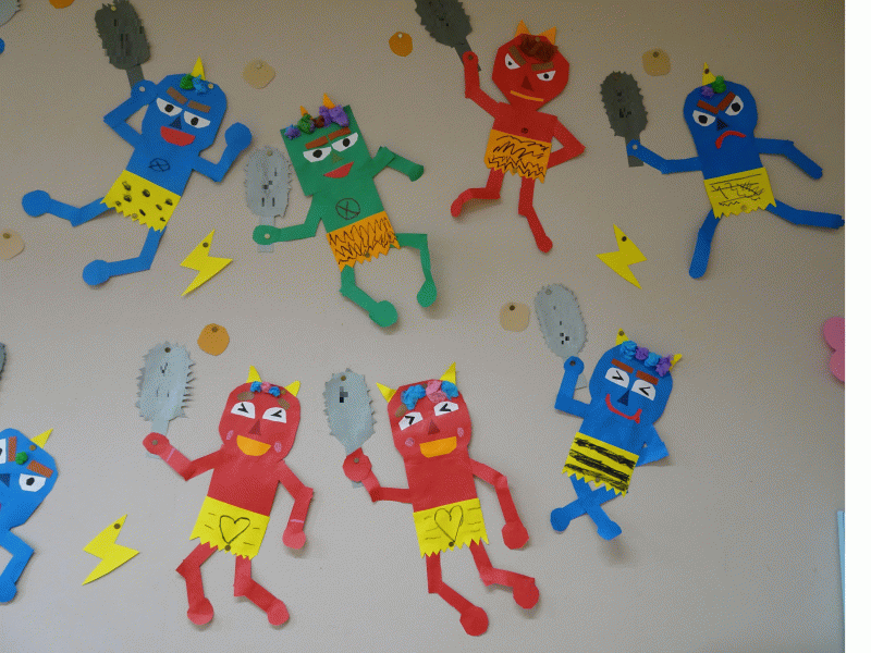 手や足は、子ども達が自分でポーズを考えて貼り合わせ、「手は後ろにしようかな」「怒ってるポーズにしよう!」と友達と話しながら、楽しそうに作り上げる姿が見られました(^O^)
