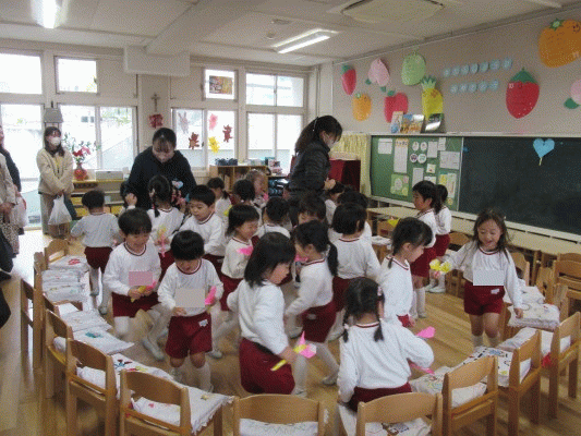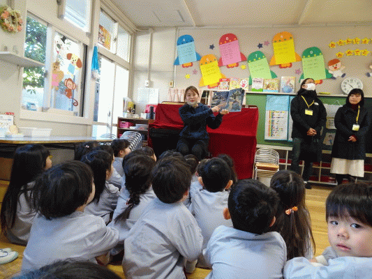 『まいごのひつじ』の絵本を用いて「神様は姿は見えないけれど、いつもみんなのことを守ってくれています。お友達のことを思いやり、困っていたり、泣いているお友だちがいたら助けてあげてね。これからも、お友だちのことを大事にしながら過ごしましょう。」とシスターからお話がありました。