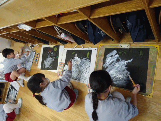 話しを聞いた子ども達は、クレパスやスモックを準備して、早速雪だるまを描いていきます!
