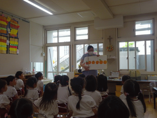 聖歌「あの空はどうして青い」を歌った後、園長先生から「先生の話をよく聞いて、約束を守って楽しくあそびましょう」とお話をいただきました。