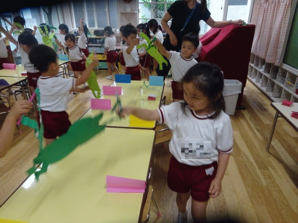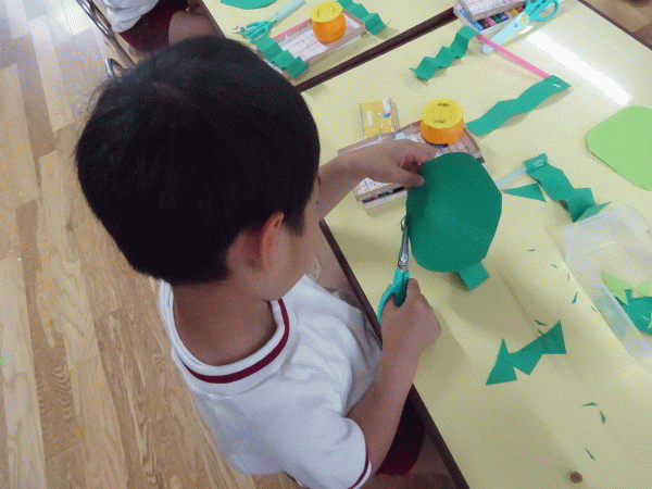 「どんな模様にしようかな?」「この模様は何色にしようかな〜」と楽しみながら集中して丁寧に取り組む姿が見られ、背景に貼り付けて立体的に完成した時は、とても嬉しそうでした(*^_^*)