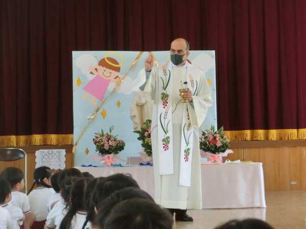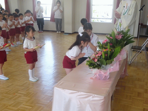 年少組祝福後、ジョバンニ神父様が来てくださり、年中組と年長組が聖母祭を行いました。
