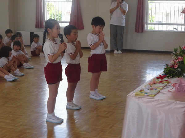 幼稚園で一番大きいお兄さん、お姉さんになり、年少組のお世話を率先してしている様子や、「年長組!」という自覚を持って日々過ごしていること、年長組ならではの行事への取組みが始まることなどのお話をさせていただきました。