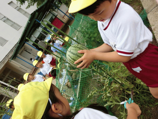 年中組で育てている『スイカ』が実ったので、収穫しました(^^)