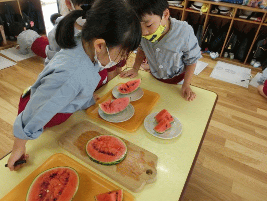 クラスに持って帰って、子ども達と切り方を相談をして実際にスイカを切って中も観察しました。