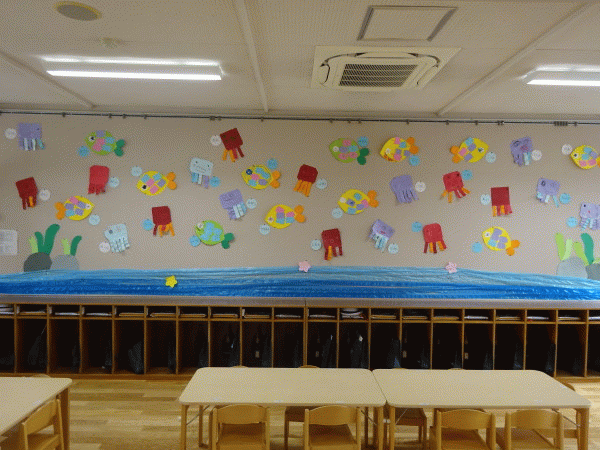 雨が続く梅雨の季節にぴったりの素敵な壁面になりました(^-^)