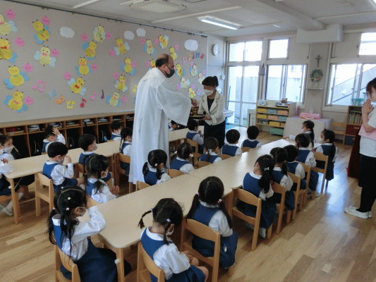 幼稚園での祝福式後、ジョバンニ神父様が来てくださり、年中組と年長組が聖母祭を行いました。