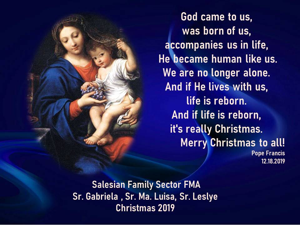 A nome dell'Ambito della Famiglia Salesiana: Sr Maria Luisa Miranda, Sr Leslye Sandigo ed io, i nostri auguri in questo bel tempo di Natale. La Vergine Maria ci aiuti a contemplare il mistero del presepio e a meterci in ascolto del suo Figlio che ci chiede di accoglierlo nei nostri progetti e nelle nostre scelte.