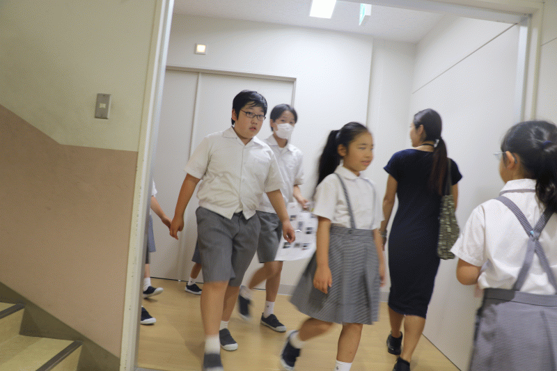 幼稚園児、小学生、高校生の縦割りチームで協力して学校中を探検します。