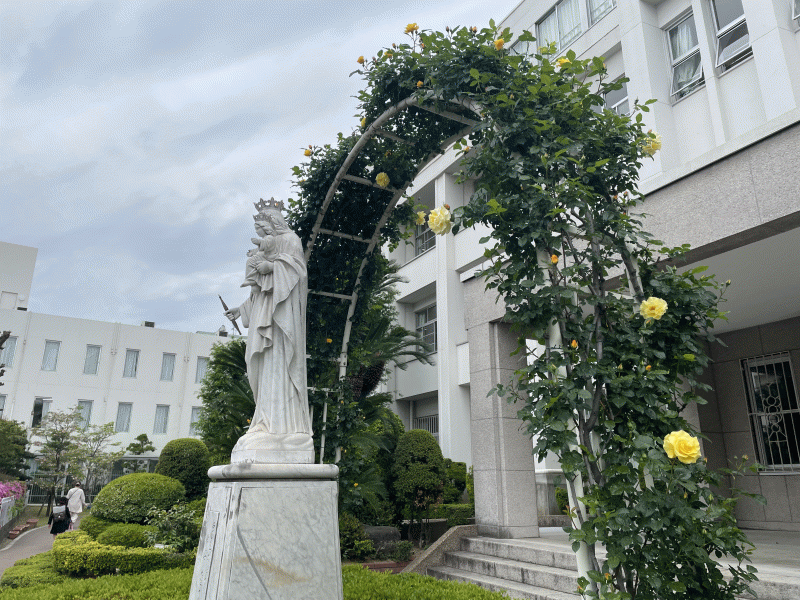 夏が近づき、正門前のマリア像のアーチには、一輪ずつ黄色いバラが開花しています。